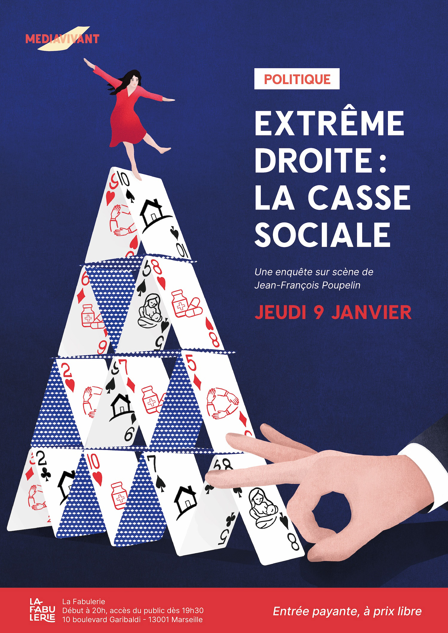 Illustration réalisée pour l'affiche de Mediavivant pour l'enquête sur scène sur la casse sociale engendrée par l'extrême droite dans les communes dans lesquelles elle est au pouvoir.